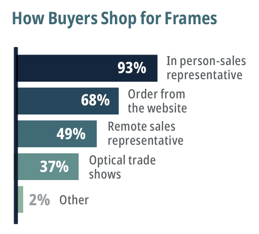 The vast majority of frame and sunwear buyers (93%) make purchases through in-person meetings with reps, while 68% also tap their vendors’ websites. Nearly 4 out of 10 (37%) say optical trade shows are a great place to purchase product.