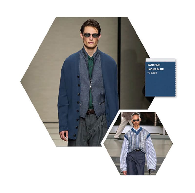 This season’s luxurious blue hue made waves on both the Giorgio Armani (left) and Tory Burch runways, both paired with on-trend oval sunglasses from EssilorLuxottica.