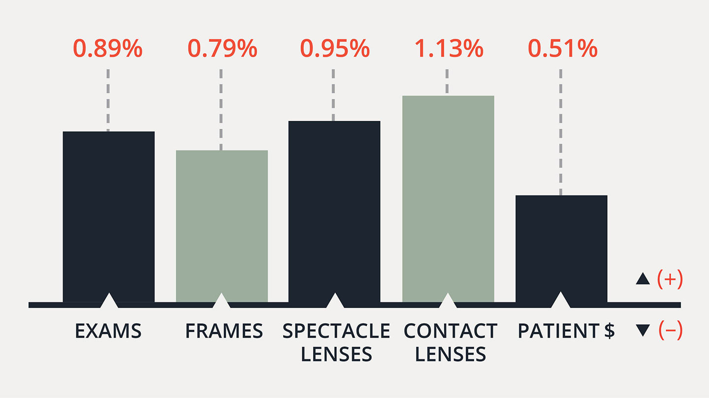 These data apply to all independent and group eyecare practices conducting comprehensive exams. Practices seeing growth below the national +2.4% average face the most urgency.